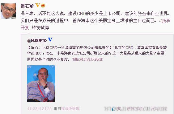 4月20日,萬通控股董事長馮侖在中山大學(xué)嶺南學(xué)院的演講中透露,北京CBD一半以上都是當(dāng)時(shí)海南的皮包公司蓋起來的!對(duì)此,SOHO中國董事長潘石屹在微博上評(píng)論稱“馮主席,話不能這么說。建設(shè)CBD的多少是上市公司,建設(shè)的資金來自全世界。我們只是在成長的過程中,曾在海南這個(gè)美麗寶島上艱難的生存過而已”。據(jù)悉,馮侖與潘石屹同為當(dāng)時(shí)的“萬通六君子”成員。